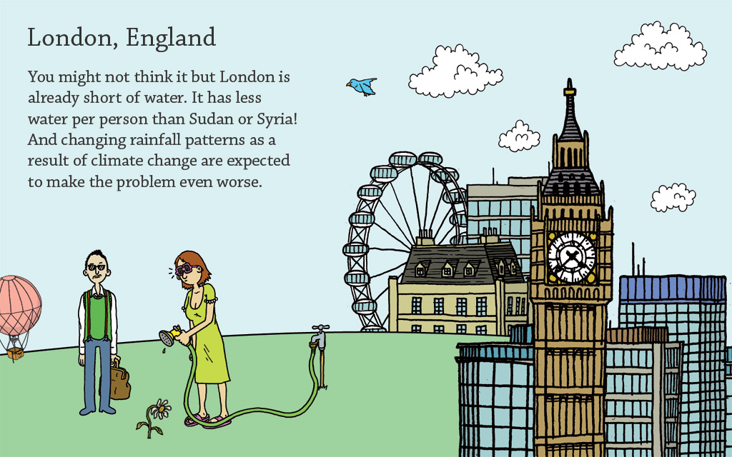 I worked on the Climate Change Adaptation Quiz where users guide Dr Nordstein around the globe to help people cope with the future impacts of climate change. He presents the user with a choice of solutions for each location, with the option of discovering more detailed information about their choice.